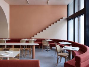 این رویکرد مشابه و جسورانه نسبت به عناصر طراحی، در حالی که همچنان فضا تا نهایت ظرفیت آن بهینه باشد، به خوبی در طراحی کافه بوداپست به نمایش درآمده است. صندلیهای نیمکتی منحنی از جلوی کافه در زیر یک حجم دو طبقه عبور میکنند. یک میز بار عمومی در مرکز فضا قرار گرفته است و یک طاق تونلی در پشت کافه، علارغم اینکه نگاه مهمانان را بیشتر به فضا جلب میکند، پیشخوان اصلی را قاب میکند و به فضا بعد می دهد. یک راه پله نمادین به سبک اندرسن از دیوار کناری کافه بالا میرود و سپس به طرز مرموزی از قاب ناپدید میشود. در دیوار روبرو، این اثر خیالانگیزِ ترومپ-لوئیل* توسط یک راه پله دیگر که در یک فرورفتگی قوسی قرار دارد، تکرار میشود و مشتریان را تشویق میکند تا با طراحی درگیر شوند.