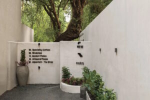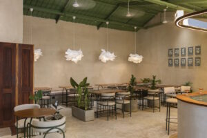 نشیمنِ طولانیای که از بتن آرمه ساخته و با پرداخت IPS تکمیل شده، سراسر یک دیوار را میپوشاند و در کنار آن میزهایی با پایههای فلزی و رویههای چوبِ یکتکه قرار گرفتهاند. بالای میزها، چراغهایی از جنس کاغذ معلقاند که حضور سبکی به فضا میبخشند. آثار هنری با خطِ دیوناگری روی دیوار هم آرام و نامحسوس خود را نشان میدهند.