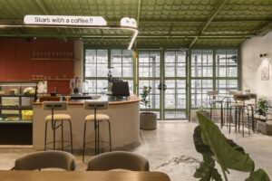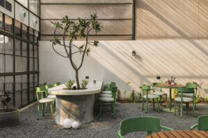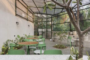 چیدمانی باز و «نفسکش» باعث شده درون و بیرون عملاً به هم گره بخورند و مهمانها در تمام مدت، هم از نظر دیداری و هم از نظر حسی، با منظرهی اطراف در ارتباط بمانند. کافه به سه بخشِ مشخص تقسیم شده است: با عبور از ورودی، به یک فضای غذاخوریِ جمعوجورِ روباز میرسیم که یک درخت قدیمی پسزمینهاش را میسازد. چند قدم جلوتر، به مهمترین نقطهی طراحی وارد میشویم: فضایی بزرگ با حالوهوای گلخانه که به بخش داخلیِ عقبِ بنا وصل است. میان این دو،نه کاملاً بیرون و نه کاملاً داخل،یک فروشگاه کوچکِ برند، مرتب و سنجیده جا گرفته است.