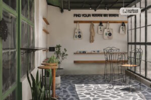 مصالح، نقش اصلی را در شکلدادن به شخصیت فضا بازی میکنند. دیوارهای اندودِ آهکی ریشه در سنتهای بومیِ ساختمانسازی هند دارند، اما برای استفادهی امروز بازخوانی شدهاند. این اندود که هم «نفسکش» است و هم از نظر حرارتی کارآمد، پسزمینهای نرم و مات میسازد که نور و صدا را ملایمتر میکند و به فضا حسِ آرامش میدهد. سفال، با رنگِ طبیعیِ نارنجیـقرمزش، سردیِ خنثیِ آهک را با گرما و عمق جبران میکند و کافه را در حسِ آشنایی و صمیمیت ریشهدار میسازد. متریالِ مهمِ دیگر، کفسازیِ IPS با پرداختِ دستی است؛ کفی که زیر پا راحت است و آدم را به آهستهتر رفتن و بیشتر ماندن دعوت میکند و در عین حال، یادِ خانههای قدیمی و ریتمِ بیعجلهی کودکی را زنده میکند.