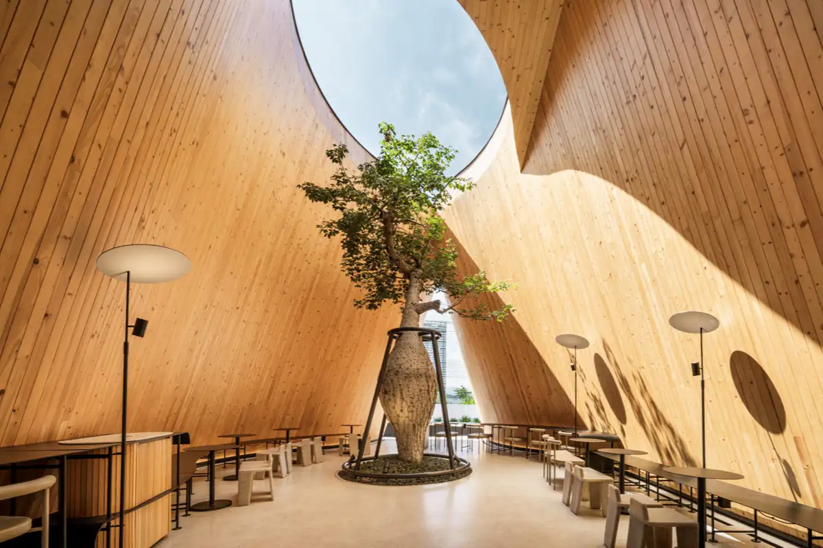 هویت برند عمیقا از فرهنگ ژاپنی الهام گرفته شده است، چیزی که معماران IDIN آن را به عنوان “سادگی فروتنانه با توجه به جزئیات” تفسیر میکند. این سادگی از طریق نمای بیرونی، متشکل از سه فرم ساده به رنگ سیاه برای ظاهری ظریف و مینیمال که با دیوارهای چوبی کاج گرم طبیعی فضای داخلی در تضاد است، نمایان میشود. فرمهای شیروانی انتخاب شده برای حجم نیز یک عنصر معماری مشترک در شرق آسیا است که بومی بوده و کاملا ساده است. با ورود بازدیدکنندگان از طریق این فرمهای خالص، فضا به تدریج با منحنیها تغییر شکل یافته و خم میشود، تا دعوت کنندگی بیشتری ایجاد کند و مخاطبینش را به اعماق هدایت کند، جایی که فضا پویاتر میشود و اثر ماندگاری بر مهمانان می گذارد.